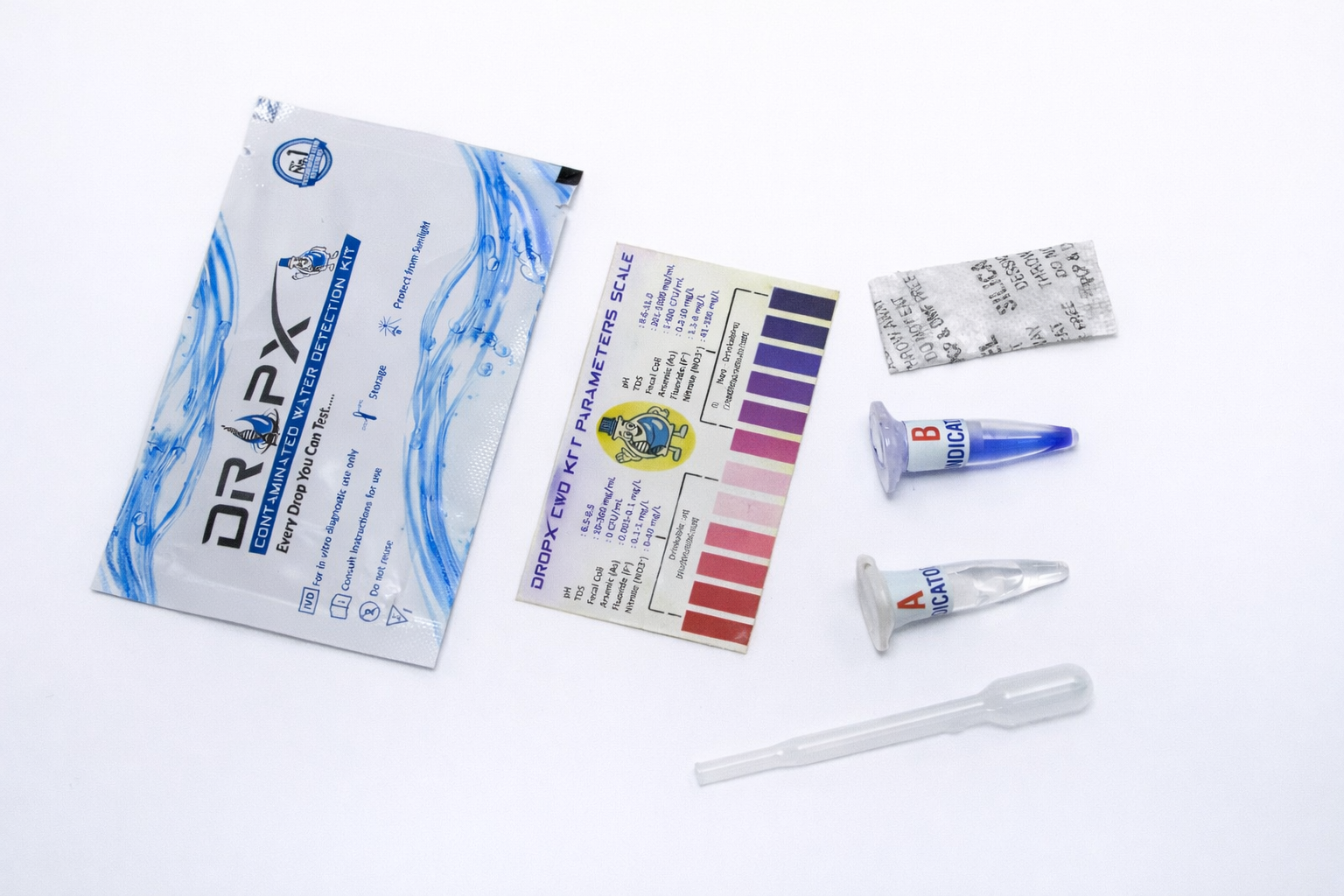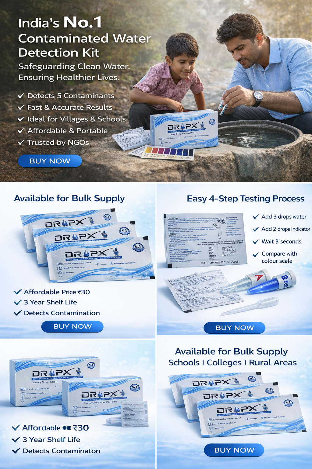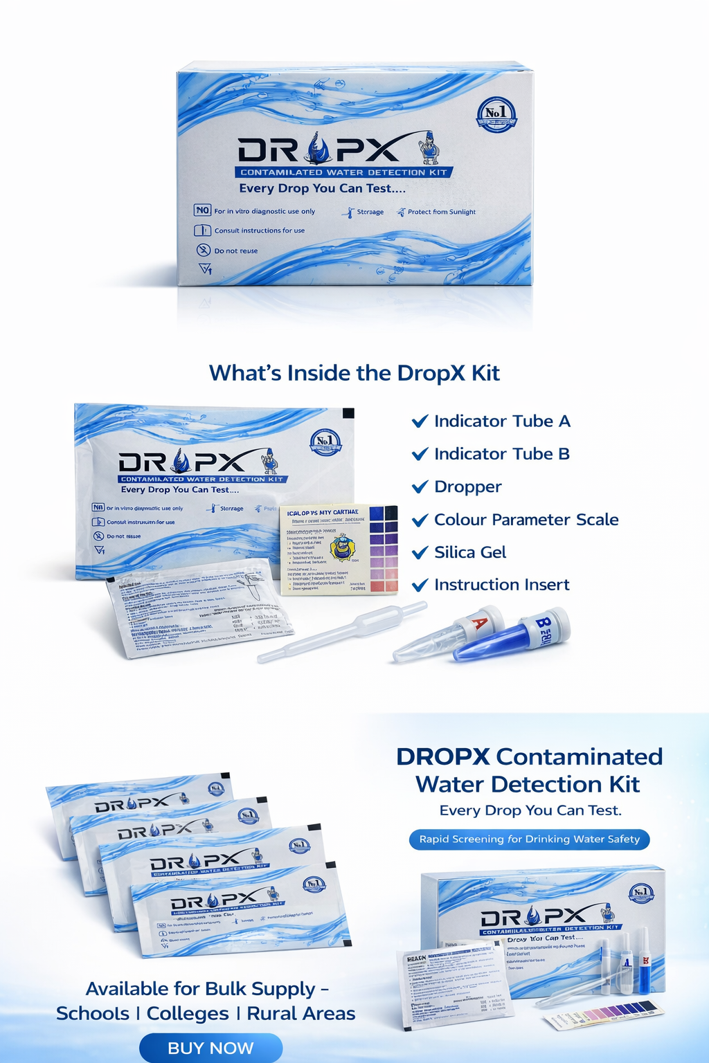A rapid, low-cost water testing kit that detects harmful contaminants in drinking water within seconds. Designed for use in rural, urban, and emergency settings, DropX is compact, easy to use, and powered by colorimetric detection chemistry.